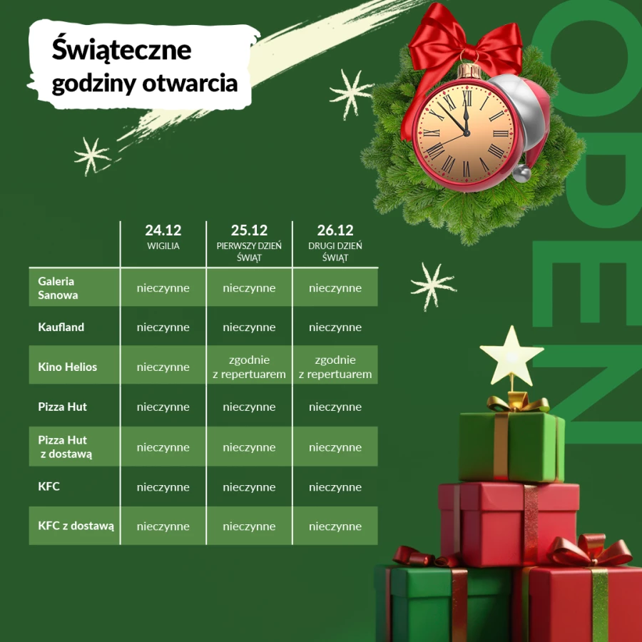 W dniach 25 i 26 grudnia sklepy Galerii Sanowa będą nieczynne. Zapraszamy jednak do odwiedzenia lokali, które tego dnia pozostaną dla Was otwarte. Sprawdźcie godziny ich otwarcia, zapraszamy!