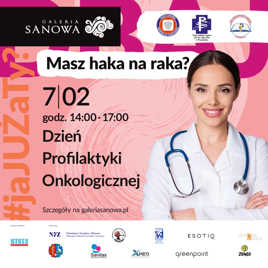 Odpowiedzi na te i inne pytania będziecie mogli uzyskać już 7 lutego br. w Galerii Sanowa! Wspólnie z Powiatową Stacją Sanitarno-Epidemiologiczną w Przemyślu, Wojewódzkim Szpitalem im. Św. Ojca Pio w Przemyślu oraz Medyczno-Społecznym Centrum Kształcenia Zawodowego i Ustawicznego w Przemyślu, zapraszamy na czwartą edycję akcji „Masz haka na raka?” czyli Dzień Profilaktyki Onkologicznej. W godz. 14:00 – 17:00 Klienci galerii będą mogli zdobyć najważniejsze informacje związane z tematyką profilaktyki onkologicznej, dowiedzieć się o tym, jak ważny jest styl życia, jakie badania warto wykonać oraz jak radzić sobie z diagnozą choroby nowotworowej.