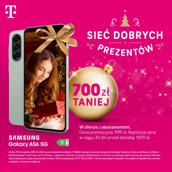Teraz Samsung Galaxy A56 5G 700 zł taniej w ofercie z abonamentem. Zniżka 700 zł zawiera 200 zł zniżki za przyniesienie do sklepu T-Mobile starego, przeznaczonego do utylizacji telefonu. Cena smartfona w „Ofercie Nielimitowanej” na 24 mies. od 75 zł/mies. z rabatami: 5 zł/mies. za zgody marketingowe i 5 zł/mies. za obsługę elektroniczną, dla nowych klientów oraz aneksów po czasie oznaczonym.