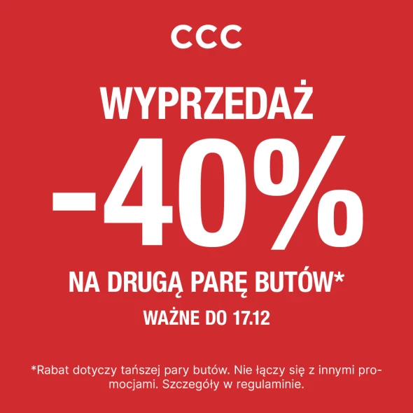 WSZYSTKIE modele obuwia od znanych marek teraz jeszcze taniej! Kup dwie pary i zyskaj rabat 40% na tańszą z nich! Skorzystaj do 17 grudnia w sklepach CCC! Szczegóły w regulaminie